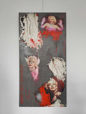My abstract works are therefore not about her portrait, but about layers and structures. About what lies beneath a shiny surface. In a series of six images with typographical statements and a visual language of collage, rough cement with crevices, cracked marble dust with fake diamonds, objectification, the break between projection and inner vulnerability, and the price women pay when their bodies become commodities and their image becomes possessions, will be addressed.